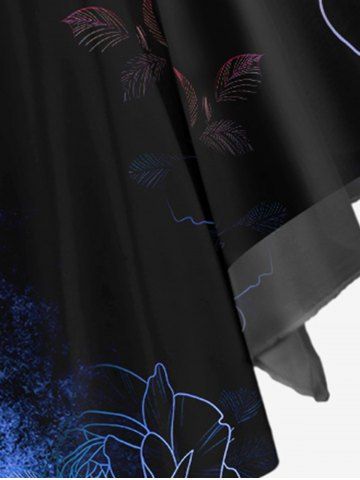 Plus Size Flare Sleeves Glitter Rose Flower Print Ombre Lattice Top - Deep Red - 1x