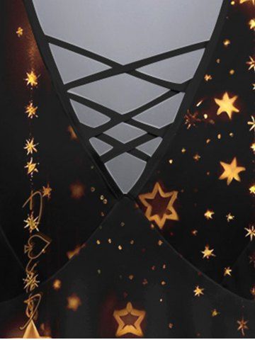 Plus Size Flare Sleeves Glitter Sparkling Christmas Light Stars Tassel Print Lattice Top - Black - 6x