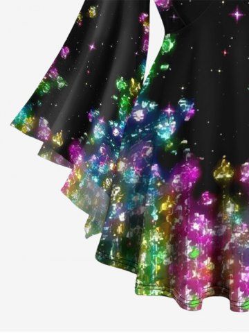 Plus Size Flare Sleeves Glitter Sparkling Colorful Broken Diamond Print Lattice Top - Multi-a - 3x