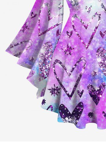 Plus Size Flare Sleeves Glitter Sparkling Heart Star Sequins Print Ombre Lattice Top - Purple - 3x