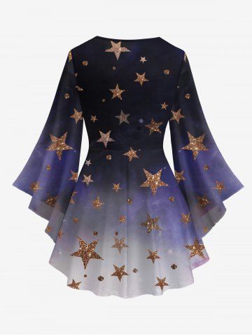 Plus Size Flare Sleeves Glitter Sparkling Stars Print Ombre Lattice Top - Concord - S