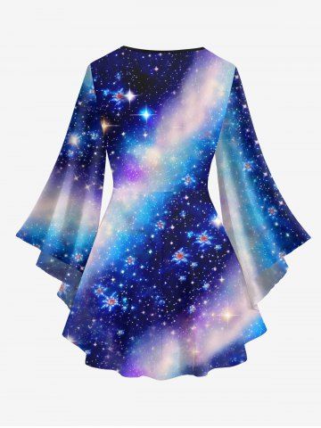 Plus Size Flowers Colorblock Galaxy Stars Sparkling Sequin Glitter 3D Print Lattice Crisscross Flare Sleeve Top - Deep Blue - 5x