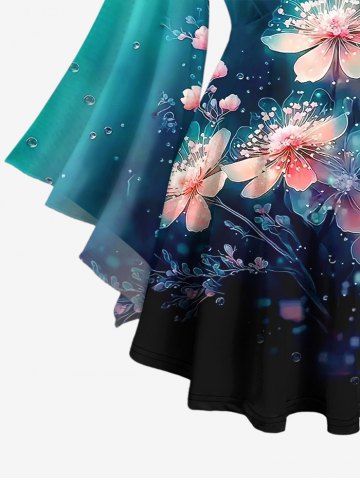 Plus Size Flowers Dewdrop Waterdrop Christmas Print Lattice Crisscross Flare Sleeve Top - Green - 5x