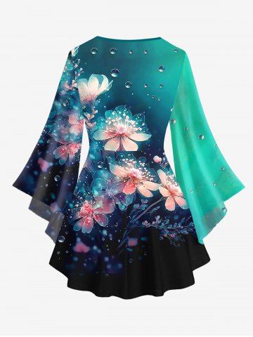 Graphic Long Sleeves > Plus Size Flowers Dewdrop Waterdrop Christmas Print Lattice Crisscross Flare Sleeve Top