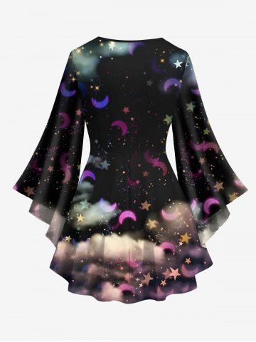 Plus Size Galaxy Moon Star Cloud Sparkling Sequin Glitter 3D Print Lattice Crisscross Flare Sleeve Top - Black - 1x