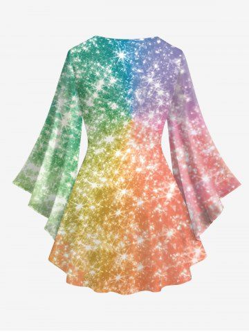 Plus Size Galaxy Ombre Colorblock Sparkling Sequin Glitter 3D Print Lattice Crisscross Flare Sleeve T-shirt - Multi-a - S
