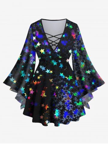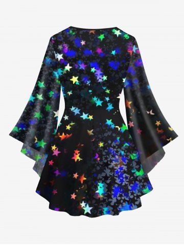 Graphic Long Sleeves > Plus Size Glitter Colorful Stars Bowknot Print Flare Sleeves Ombre Lattice Top