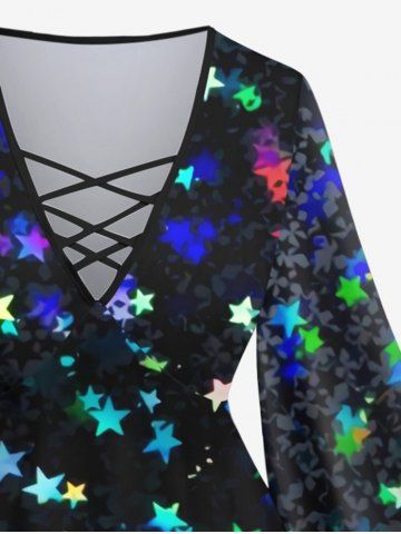 Plus Size Glitter Colorful Stars Bowknot Print Flare Sleeves Ombre Lattice Top - Multi-a - 6x