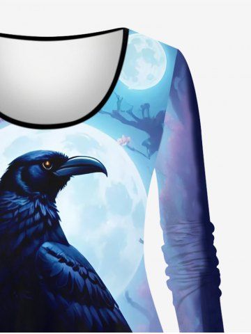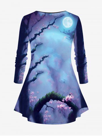 Plus Size Glitter Eagle Moon Tree Flower Print Ombre Long Sleeves T-shirt - Light Purple - M
