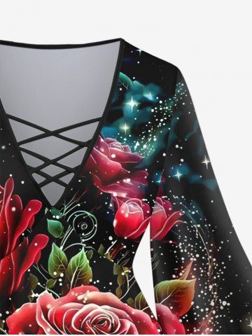 Graphic Long Sleeves > Plus Size Rose Flowers Star Glitter Sparkling Sequin 3D Print Lattice Crisscross Flare Sleeve Top