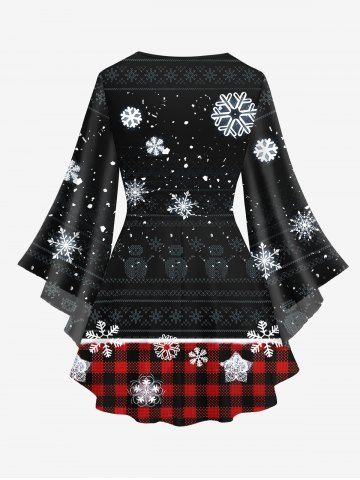 Plus Size Santa Claus Snowflake Elk Plaid Print Lattice Christmas Flare Sleeves Top - Black - 3x