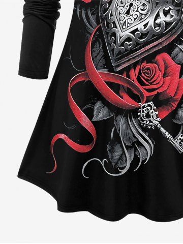 Plus Size Valentine's Day Rose Flower Ribbons Heart Pendant 3D Print Long Sleeve T-shirt - Black - Xs
