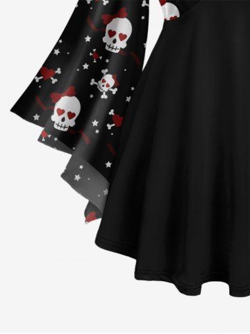 Plus Size Valentine's Day Skull Skeleton Heart Ribbon Stars Print Lattice Crisscross Flare Sleeve Top - Black - M