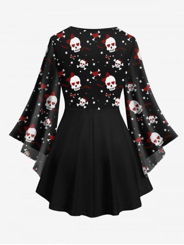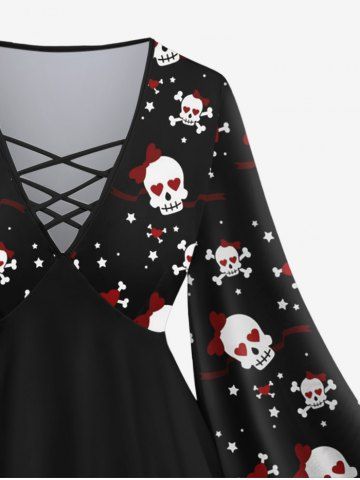 Plus Size Valentine's Day Skull Skeleton Heart Ribbon Stars Print Lattice Crisscross Flare Sleeve Top - Black - 1x