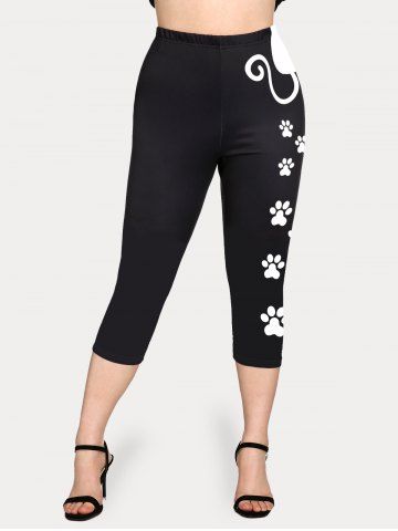 Cat Pattern Colorblock Tee and Cat-pad Printed Leggings Plus Size Summer Matching Set - Black