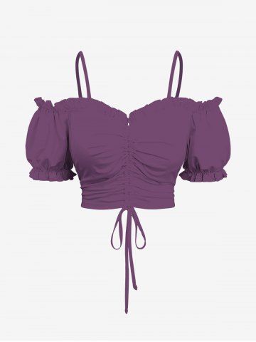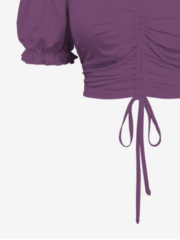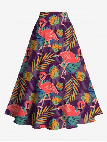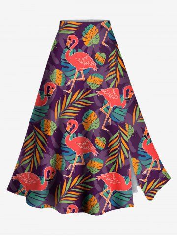 Cinched Solid Top and Colorful Tropical Leaf Flamingo Print Hawaii Split A Line Skirt Plus Size Matching Set - Purple