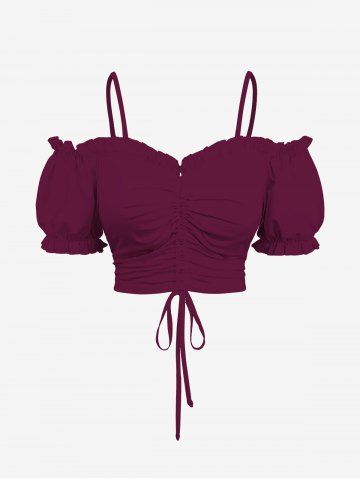 Cinched Solid Top and Rose Flower Leaf Butterfly Owl Print Halloween Split A Line Skirt Plus Size Matching Set - Deep Red
