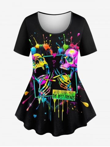 Colorful Skull Skeleton Heart Painting Splatter Print Women T-shirt and Flare Pants Plus Size Matching Set - Black
