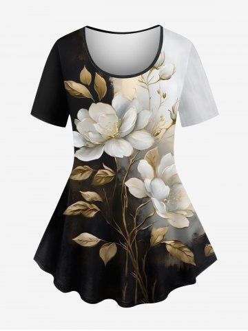 Flower Leaf Branch Contrast Colorblock Print T-shirt and Leggings Plus Size Matching Set - Black
