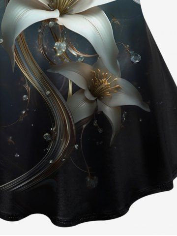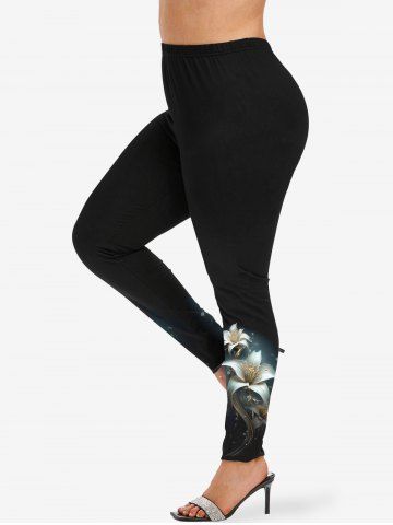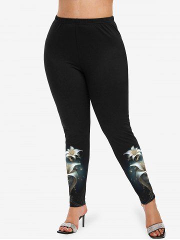 Flowers Glitter 3D Print T-shirt and Full Leggings Plus Size Matching Set - Black