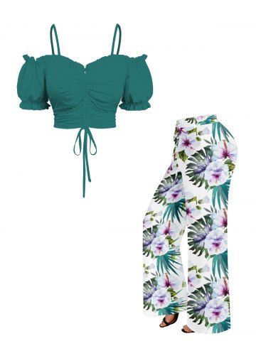 Flowers Leaf Tropical Print Plus Size Matching Hawaii Set - Green