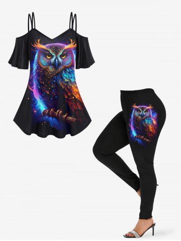 k*****h5Plus Size Galaxy Colorful Owl Star Glitter 3D Print Cold Shoulder T-shirtColor: BLACK Size: XSVery cute and playful design I had to order another one for my granddaughter