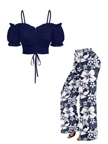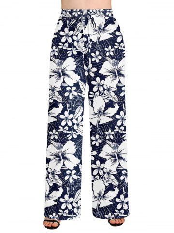 Hibiscus Flowers Leaf Print Plus Size Matching Hawaii Set - Navy Blue