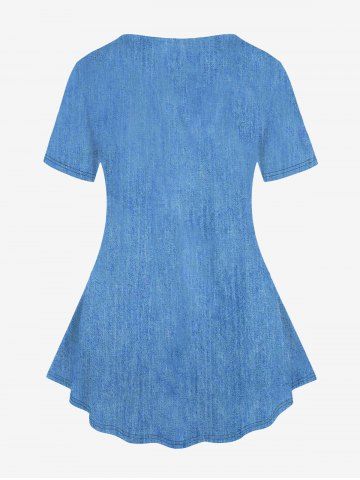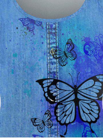 n*****a5Plus Size 3D Butterfly Print Jeans Button Round Neck T-ShirtColor: BLUE Size: 2X | US 18-20I'm not a big fan of flashy clothes and this is right up my alley. The fabric is so soft I want to wear this tunic all the time. It lets the air flow and keeps me cool.