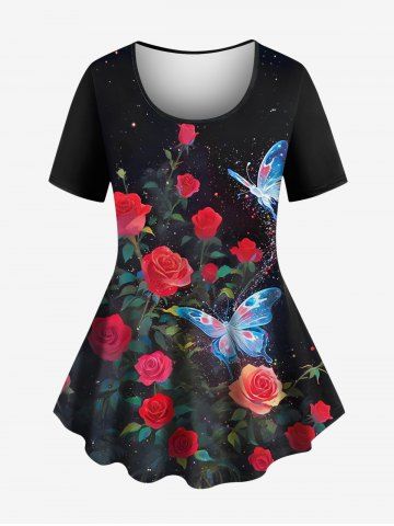Rose Flower Glitter Butterfly Print Women T-shirt and Leggings Plus Size Matching Set - Black