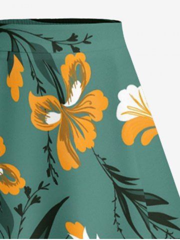 Graphic Outfits > Solid Cinched Top and Flower Leaf Branch Print Hawaii Split A Line Skirt Plus Size Matching Set