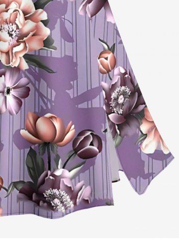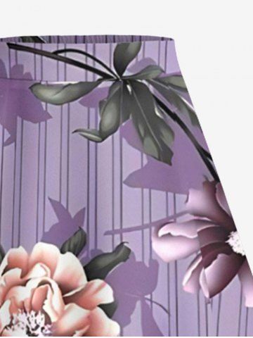 Solid Cinched Top and Flower Leaf Striped Print Hawaii Split A Line Skirt Plus Size Matching Set - Light Purple