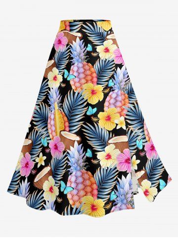 Graphic Outfits > Solid Cinched Top and Tropical Leaf Hibiscus Flower Pineapple Coconut Print Hawaii Split A Line Skirt Plus Size Matching Set