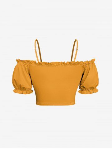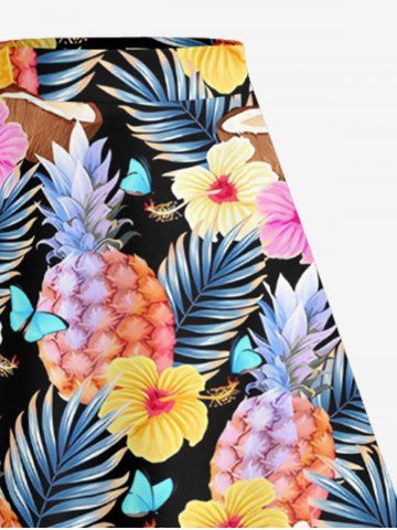 Solid Cinched Top and Tropical Leaf Hibiscus Flower Pineapple Coconut Print Hawaii Split A Line Skirt Plus Size Matching Set - Yellow