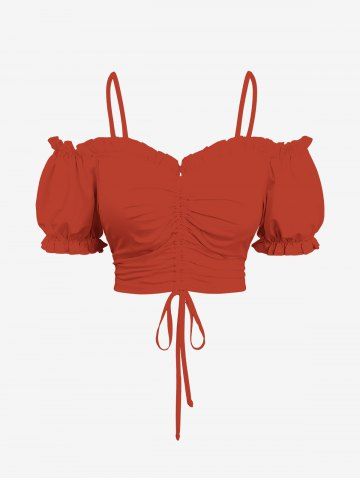 Solid Cinched Top and Tropical Leaf Hibiscus Flower Print Hawaii Split A Line Skirt Plus Size Matching Set - Orange