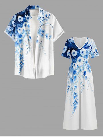 Flowers Leaf Print V Neck Hawaii Wide Leg Jumpsuit - Blue - Xl