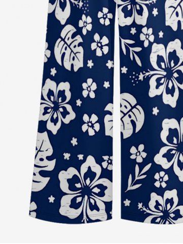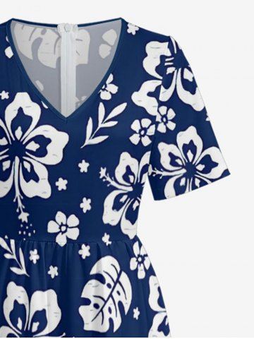 Hibiscus Flowers Tropical Leaf Print V Neck Hawaii Wide Leg Jumpsuit - Deep Blue - Xl
