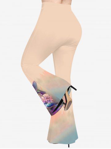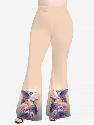 Plus Size Birds Flower Watercolor Ombre Print Flare Pants - Champagne - 4x