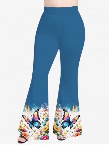 Plus Size Butterfly Floral Rainbow Print Flare Pants - Blue - 3x