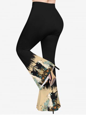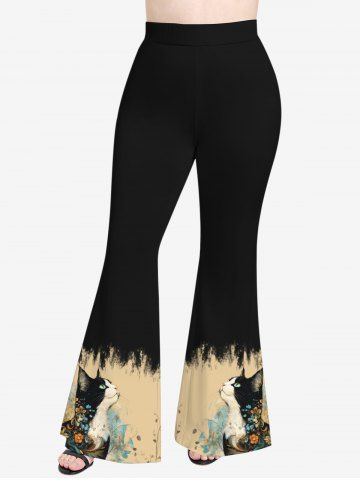 Plus Size Cat Flower Print Flare Pants - Black - L