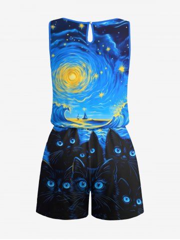 Plus Size Cat Sea Waves Painting Galaxy Print Hawaii Drawstring Pocket Romper - Sky Blue - 2x