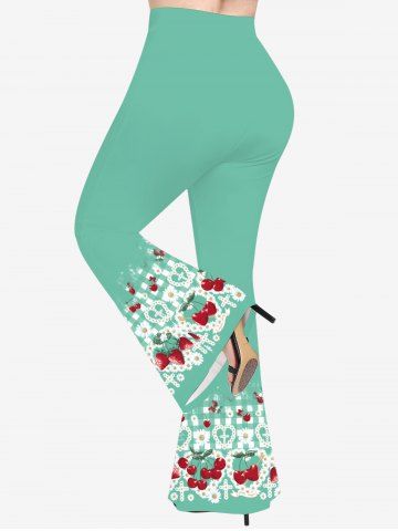 Plus Size Cherry Strawberry Daisy Heart Cross Plaid Print Flare Pants - Green - M