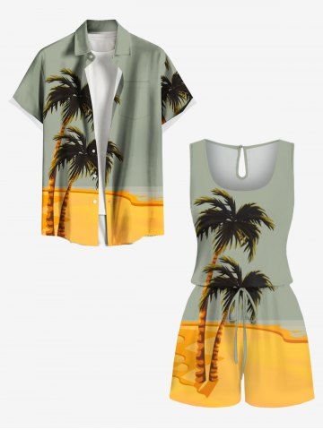 Plus Size Coconut Tree Beach Colorblock Print Cinched Hawaii Romper - Green - 2x