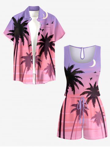 Plus Size Coconut Tree Bird Moon Ombre Print Cinched Hawaii Romper - Purple - M