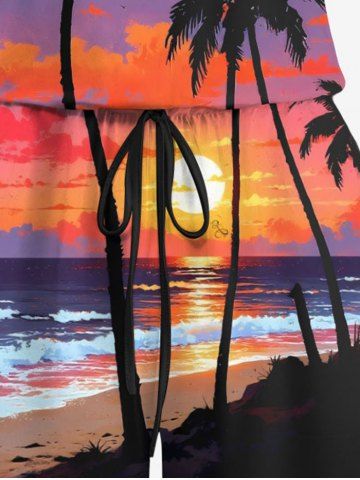 Graphic Pants > Plus Size Coconut Tree Cloud Sun Seascape Print Cinched Hawaii Romper