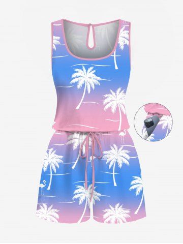 Plus Size Coconut Tree Flamingo Ombre Colorblock Print Cinched Hawaii Romper - Light Blue - Xxs