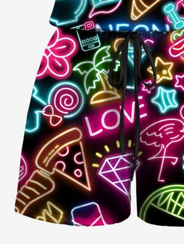 Plus Size Coconut Tree Heart Flower Juice Neon Print Cinched Hawaii Romper - Black - 4x