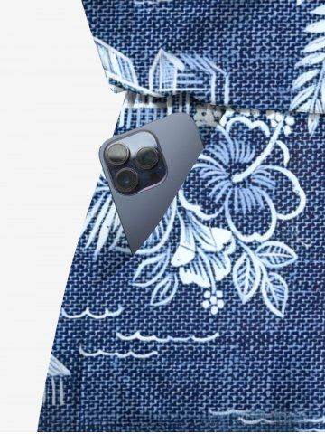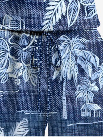 Plus Size Coconut Tree Hibiscus Flowers Leaf Print Cinched Hawaii Romper - Midnight Blue - S