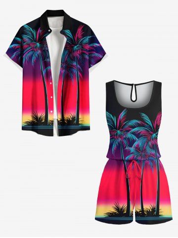 Graphic Pants > Plus Size Coconut Tree Ombre Colorblock Print Cinched Hawaii Romper