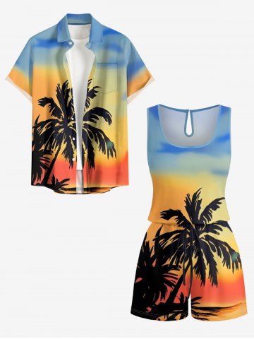 Graphic Pants > Plus Size Coconut Tree Ombre Colorblock Print Cinched Hawaii Romper