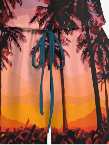 Plus Size Coconut Tree Ombre Sky Oil Painting Print Cinched Hawaii Romper - Red - 3x